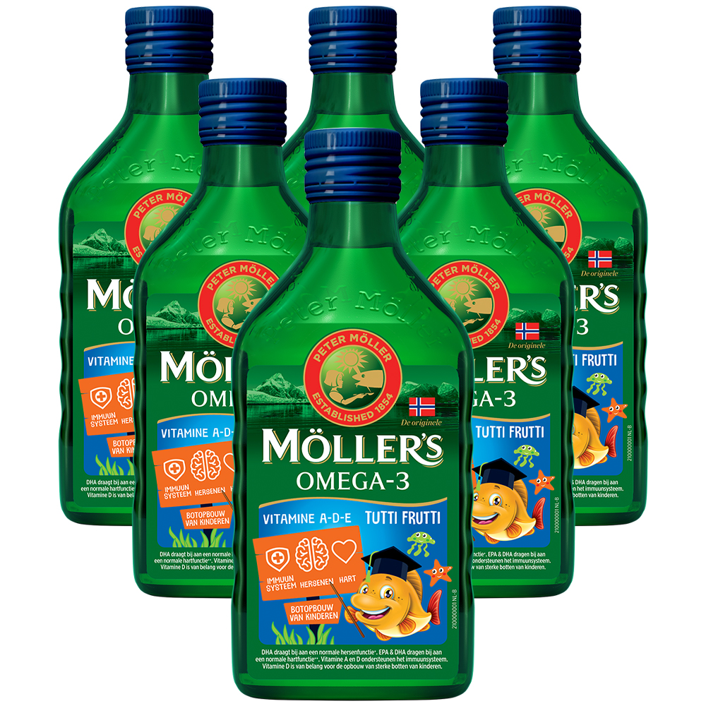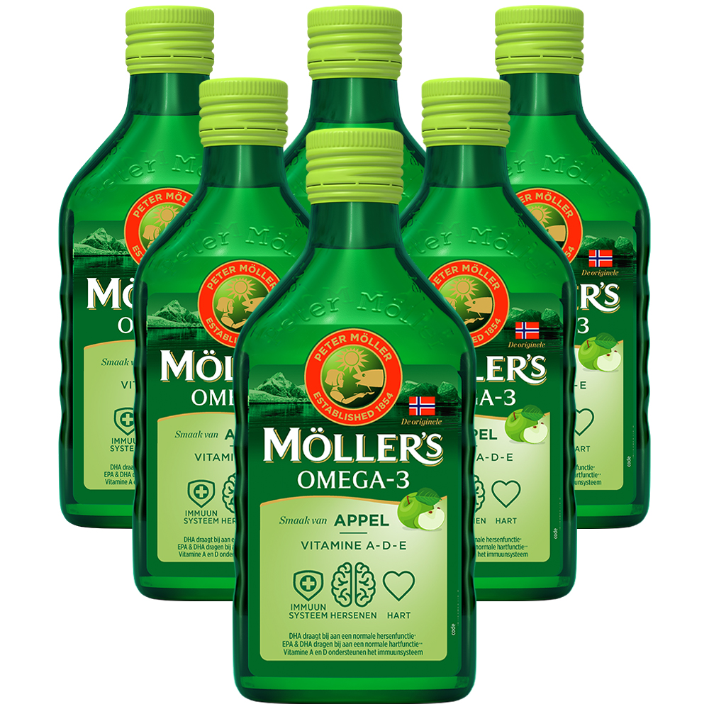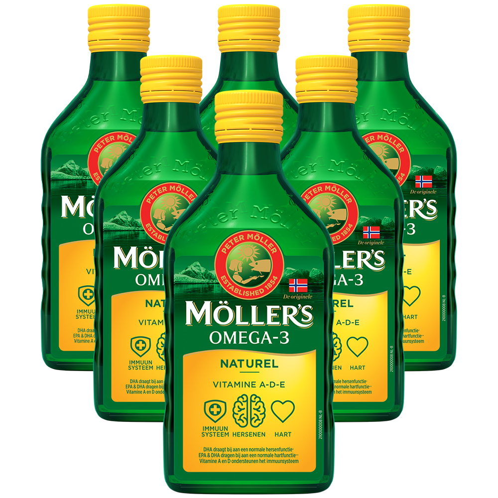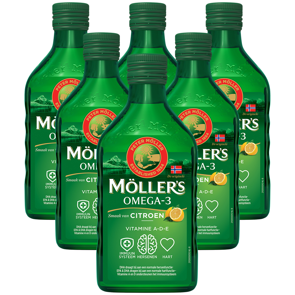 - 6 flessen Möller’s Omega-3 (250 ml) in smaken naar keuze: Naturel, Citroen, Appel, Tutti Frutti